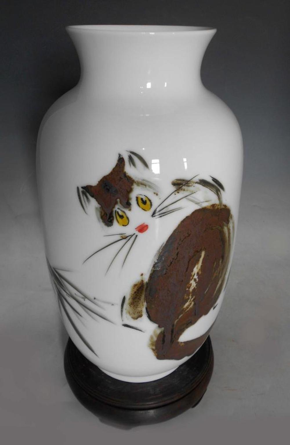 猫咪作品采用窑变釉作为手绘色料,再用黑色颜料进行点缀,形成了一种特别的艺术风格。采用大写意的技法粗犷地表现了猫咪的神情。