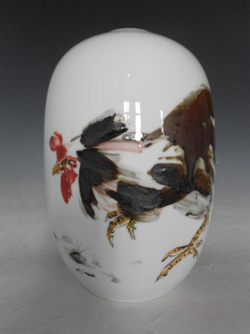 作品采用窑变釉作为手绘色料,再用黑色颜料进行点缀,形成了一种特别的艺术风格。采用大写意的技法粗犷地表现了公鸡觅食的神态。