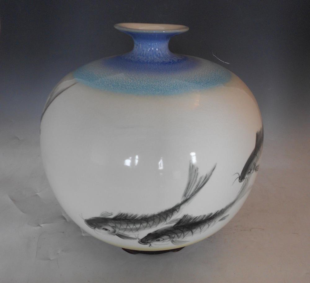 花瓶《游》作品用窑变反应釉在口沿和底部上下呼应,中间在裂缝釉下用写意画的技法描写了几条大鲶鱼在水中畅游的情景。主体是个圆形花瓶加上裂缝釉和鲶鱼,三者为一体,寓意圆圆满满、岁岁平安、连年有余。