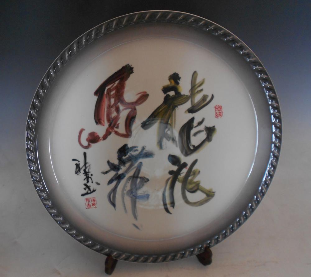 《龙凤呈祥》书法大瓷盘是陈新寿大师近年来独创的陶瓷五彩书法。从事陶瓷艺术创作三十多年的陈新寿先生经多年潜心研究,采用釉下五彩的色料,吸取写意画的技法,以他扎实的书法根底独创了这种书写形式,形成了陶瓷装饰中所独具魅力的种类。《龙凤呈祥》书法作为一种新的艺术形式,用色彩来表现它的形、神、意,使主题更加喜庆、祥和。五彩书法融合到了现代陶瓷艺术当中,彰显其独特的艺术魅力。