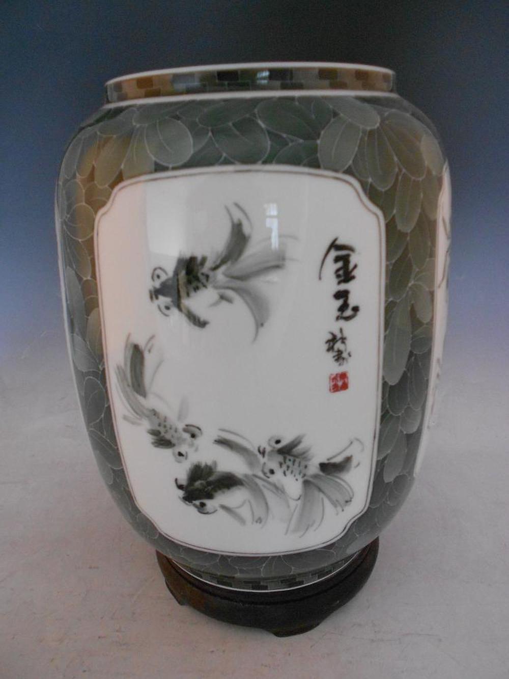 该作品在一个灯笼瓷瓶上分成四面,创作了四幅鱼类写意画。写意画周围用釉下五彩分水的技法刻画了郁郁葱葱的墨绿色树叶。作品用传统工艺加责任技艺完美地组合在一起,收藏到这样一幅画面感如此完美的瓷瓶,实属不易,值得入手。观此作,色泽交融,观之极为赏心悦目。而且,在构图上独具匠心,将鱼类动物生动地融入了画面,动静结合,无形中令画面的意趣更加丰厚,足见大师绘画的用心。
