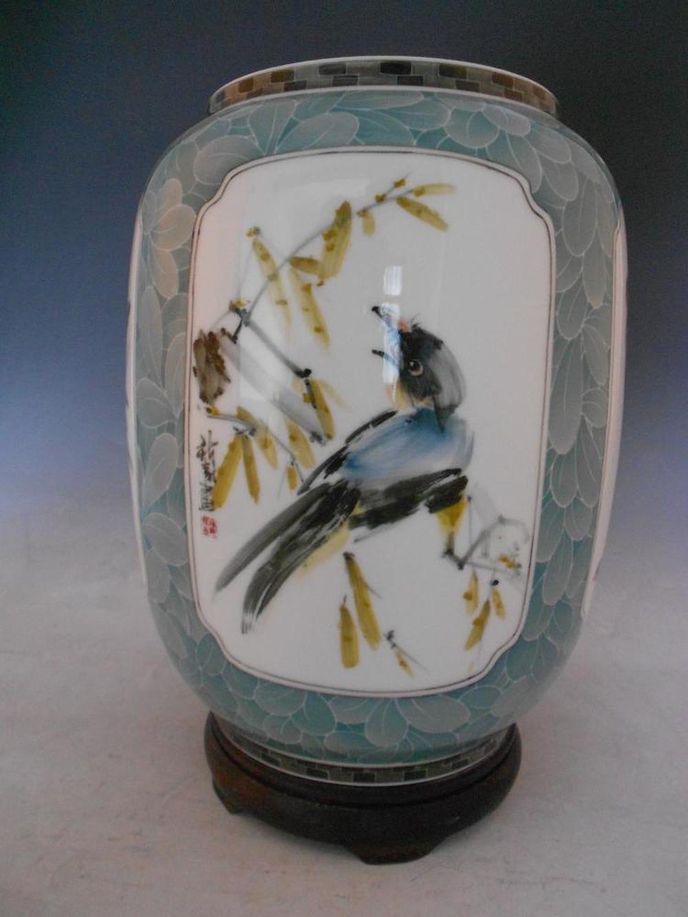 该作品在一个灯笼瓷瓶上分成四面,创作了四幅鸟类动物的写意画。写意画周围用釉下五彩分水的技法刻画了郁郁葱葱的树叶。作品用传统工艺加责任技艺完美地组合在一起,收藏到这样一幅画面感如此完美的瓷瓶,实属不易,值得入手。观此作,色泽交融,观之极为赏心悦目。而且,在构图上独具匠心,将鸟类动物生动地融入了画面,动静结合,无形中令画面的意趣更加丰厚,足见大师绘画的用心。