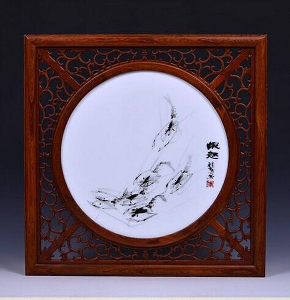 陈新寿老师对虾情有独钟,反复揣摩,大胆创新。有极深研究,将虾的眼、身、尾等都刻画细腻,立意准确,丰富了虾的造型、动态、线条,使虾的形象更为生动传神。画面用笔顿挫,色泽浓淡、稀疏呼应,精妙之至。瓷板上游玩群虾极为引人注目,群虾舞动的神韵、动感及美感都自然表现出来。画面立体感强烈,显现出虾的生动威武,千姿多态,造型优美,神韵活现,干练经典,形神兼具。