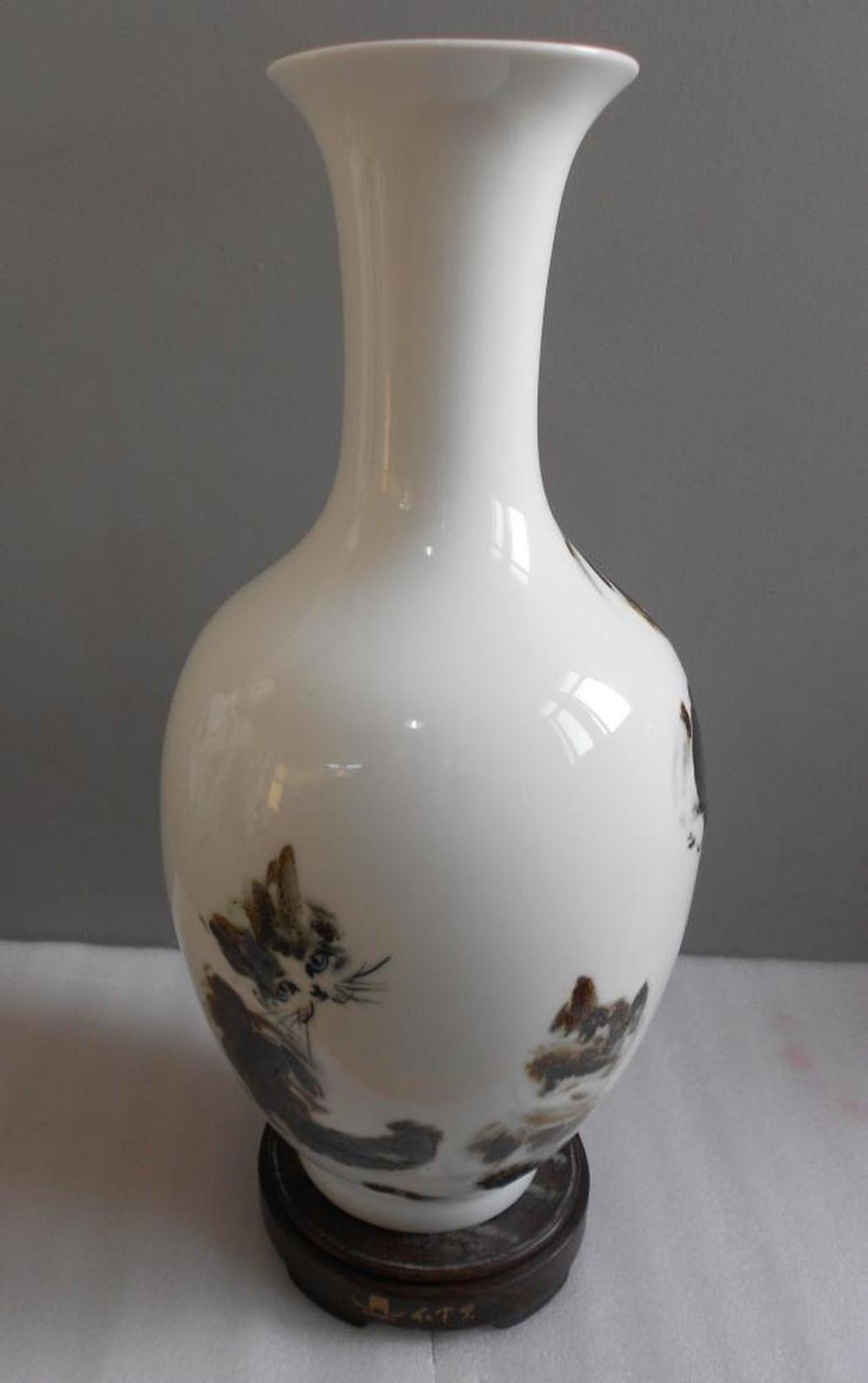 作品采用窑变釉作为绘画颜料生动地描写了猫和狗一家亲的有趣场面。